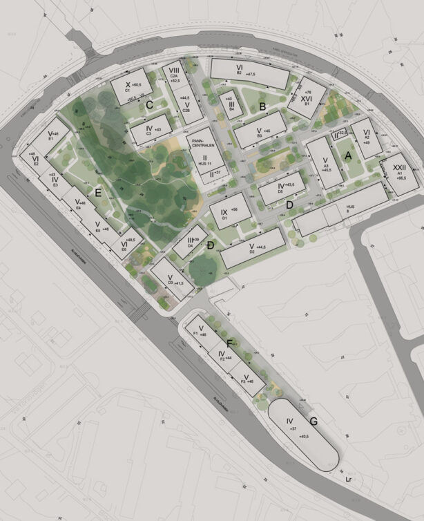 Vi vill skapa en stadsdel med nya offentliga rum som kommer till nytta även för de som bor utanför stadsdelen. Utsikt och inblick mellan huskropparna ska få besökare att känna sig välkomna till den nya stadsdelen. Öppna kvartersformer med fri sikt genom kvarteren får utemiljöerna att kännas generösa. Samtidigt som en liten nivåskillnad ger bostadsgårdarna en privat karaktär.